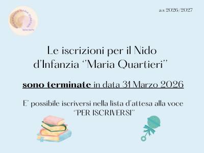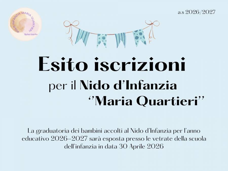 La graduatoria dei bambini accolti al nido d'infanzia per l'anno educativo 2026-2027, verrà esposta presso le vetrate della scuola dell'infanzia giovedì 30 aprile 2026.