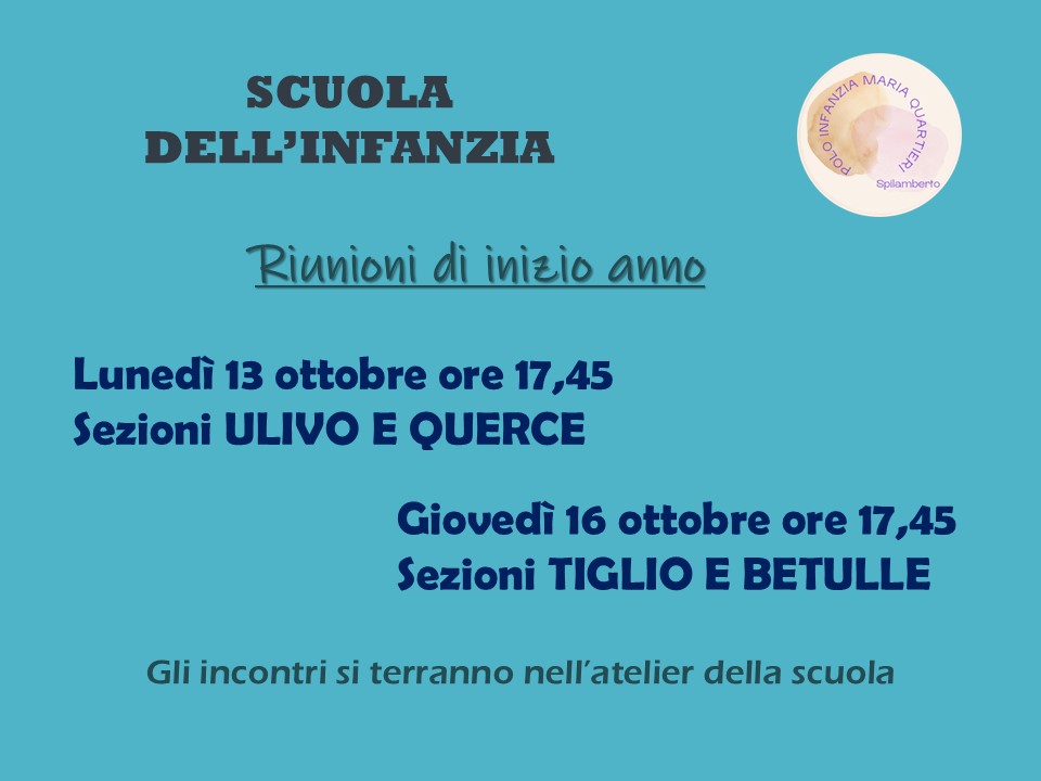 L’incontro prevede un momento comune ad entrambe le sezioni, in cui si parlerà dell’anno scolastico e, successivamente, i genitori saranno invitati ad andare nella propria classe per un momento di confronto genitori/insegnanti e l’elezione dei rappresentanti di classe.